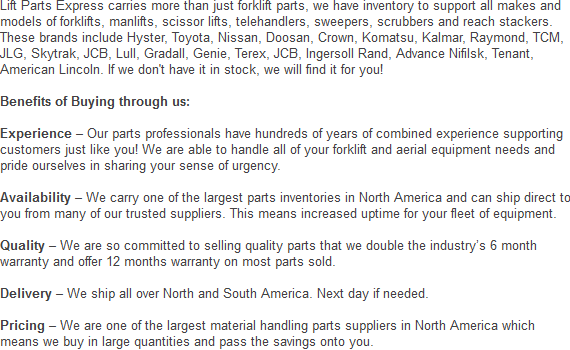 For your entire fleet of lift trucks, we offer the best prices on all our parts. Phone today to get an estimate on one of the parts or attachments we offer. We can be reached at: